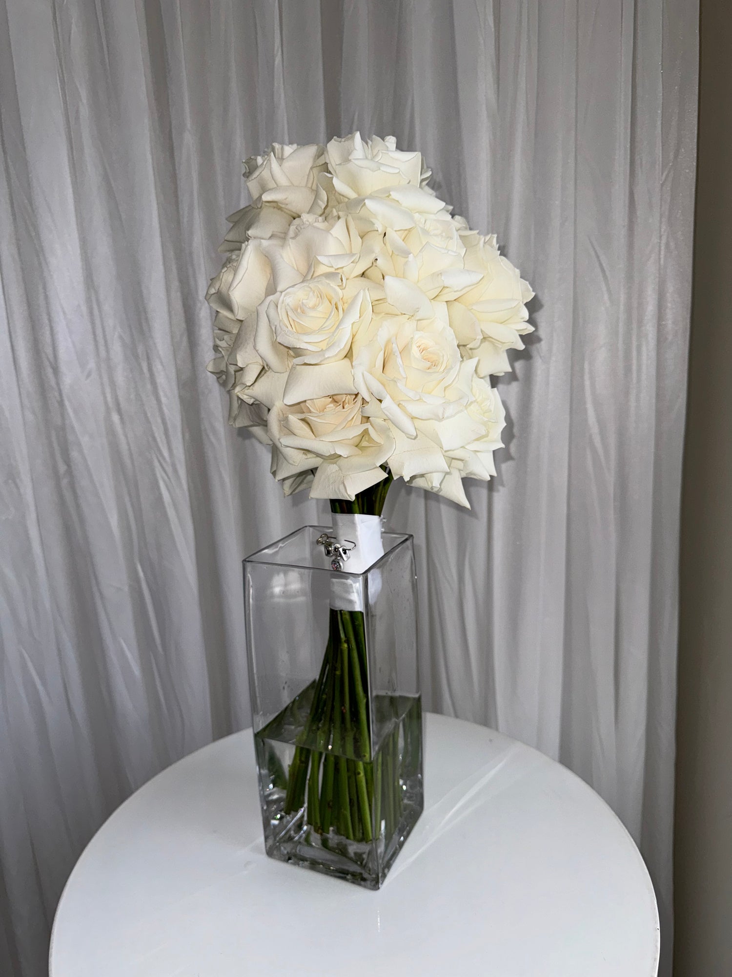 Photographed is one of our signature Bridal Bouquets, featuring reflexed roses, displayed elegantly in a vase.